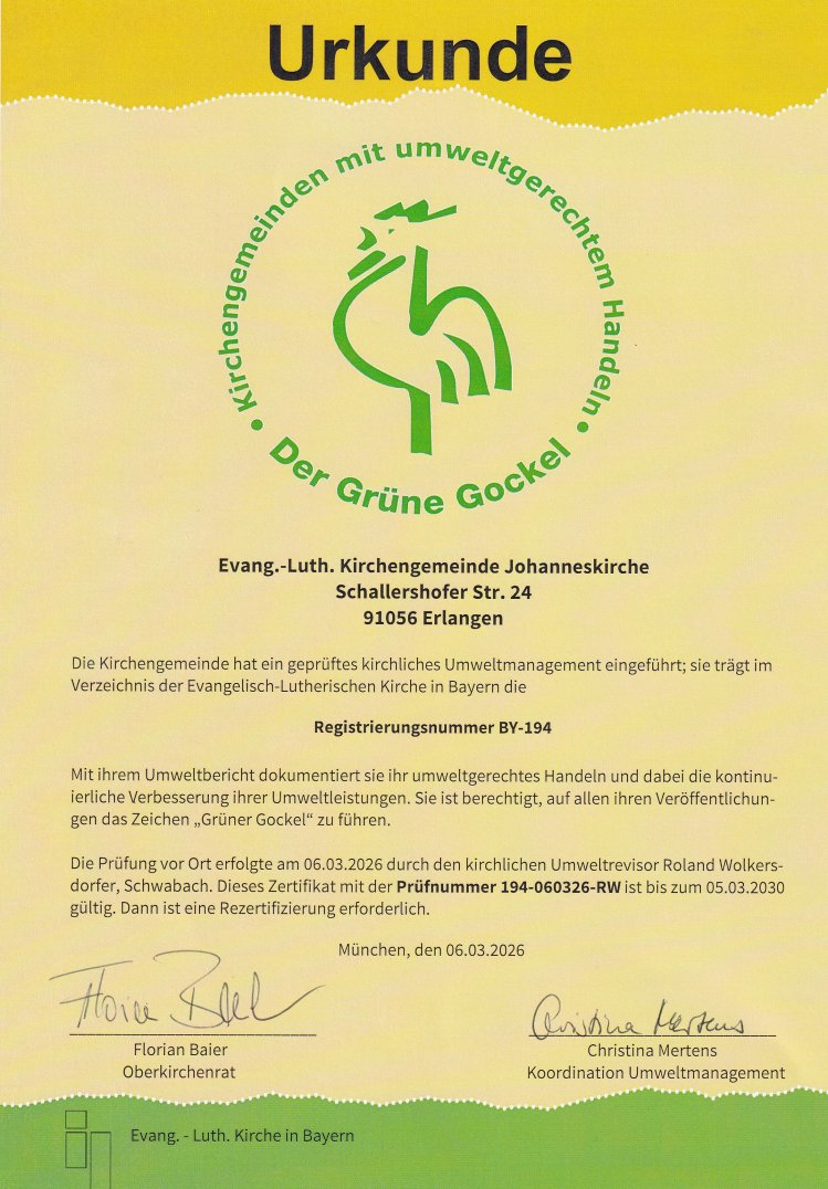 Wir machen mit!Hiermit möchten wir bekannt geben, dass die Johannesgemeinde offiziell nach dem „Grünen Gockel“ Umweltmanagementsystem zertifiziert ist. Die Urkunde ist in unten zu sehen. Momentan arbeiten wir an einem Umweltbericht für unsere Gemeinde, dieser wird voraussichtlich im Herbst zur Verfügung stehen. Das Team Umwelt steht Ihnen für weitere Fragen und Anregungen gerne zur Verfügung: umwelt [klammeraffe] johanneskirche-erlangen [punkt] de Anna Emmerth-Luft |