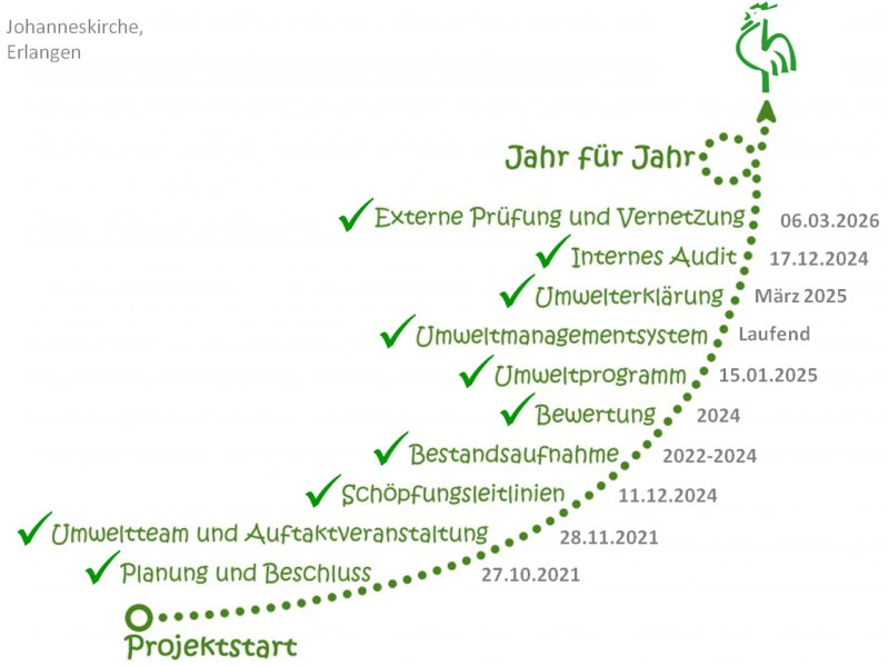 Die Schöpfung bewahren! Wir machen mit beim „Grünen Gockel“! Noch nie gehört? Der Grüne Gockel ist das Zertifikat für ein Umweltmanagementsystem in Kirchengemeinden und kirchlichen und diakonischen Einrichtungen. Sprich: Es ist ein offizielles Zeichen dafür, dass eine Gemeinde oder Einrichtung sich mittels bestimmter Kriterien für die umweltfreundliche Gestaltung des kirchlichen und diakonischen Lebens einsetzt. Dieses Zertifikat orientiert sich an den Vorgaben in der EU-Verordnung für Umweltmanagement und -audit (EMAS III-Verordnung) und hilft dabei, die Arbeit in einer Kirchengemeinde zunehmend umwelt- sowie klimafreundlich zu gestalten. Und die Johannesgemeinde Alterlangen hat sich auf den Weg gemacht! Für jede Maßnahme wird festgelegt, wer sich wann und wie um welche Aufgabe kümmert. Unser Weg zum Grünen GockelDer Kirchenvorstand hat am 27.10.2021 die Teilnahme der Johanneskirche am kirchlichen Umweltprogramm "Der Grüne Gockel" beschlossen und somit den ersten Schritt zu der zukünftigen Zertifizierung getätigt. Die Bekanntgabe den Gemeindemitgliedern erfolgte am 28.11.2021 in der Auftaktveranstaltung, welche im Rahmen eines Gottesdienstes in der Johanneskirche stattgefunden hat. Unsere 10. Schritte bis zum Grünen Gockel: |
