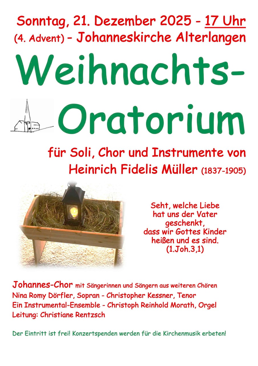 | Chor-Projekt im Übergang Weihnachts-Oratorium | Singen Sie noch mit! Übergangsweise übernimmt, wie berichtet, Pfrin. Christiane Rentzsch die Leitung des Johanneschors. Sie leitet das beschriebene Chorprojekt. Weihnachts-Oratorium. Nein, nicht von Bach, sondern von Müller. Heinrich Fidelis Müller, 1837-1905, hat die Weihnachtsgeschichte mit vertrauten, |